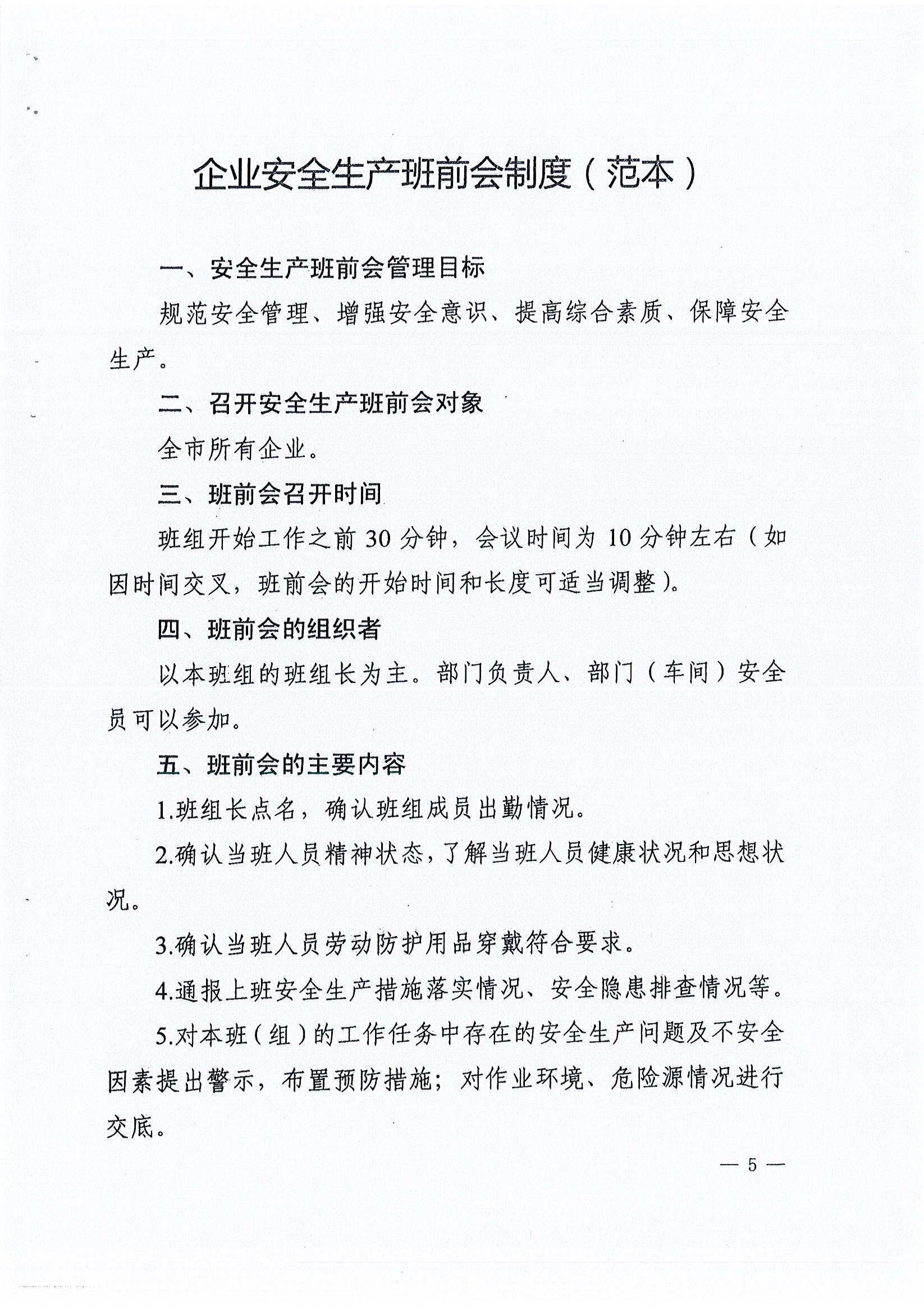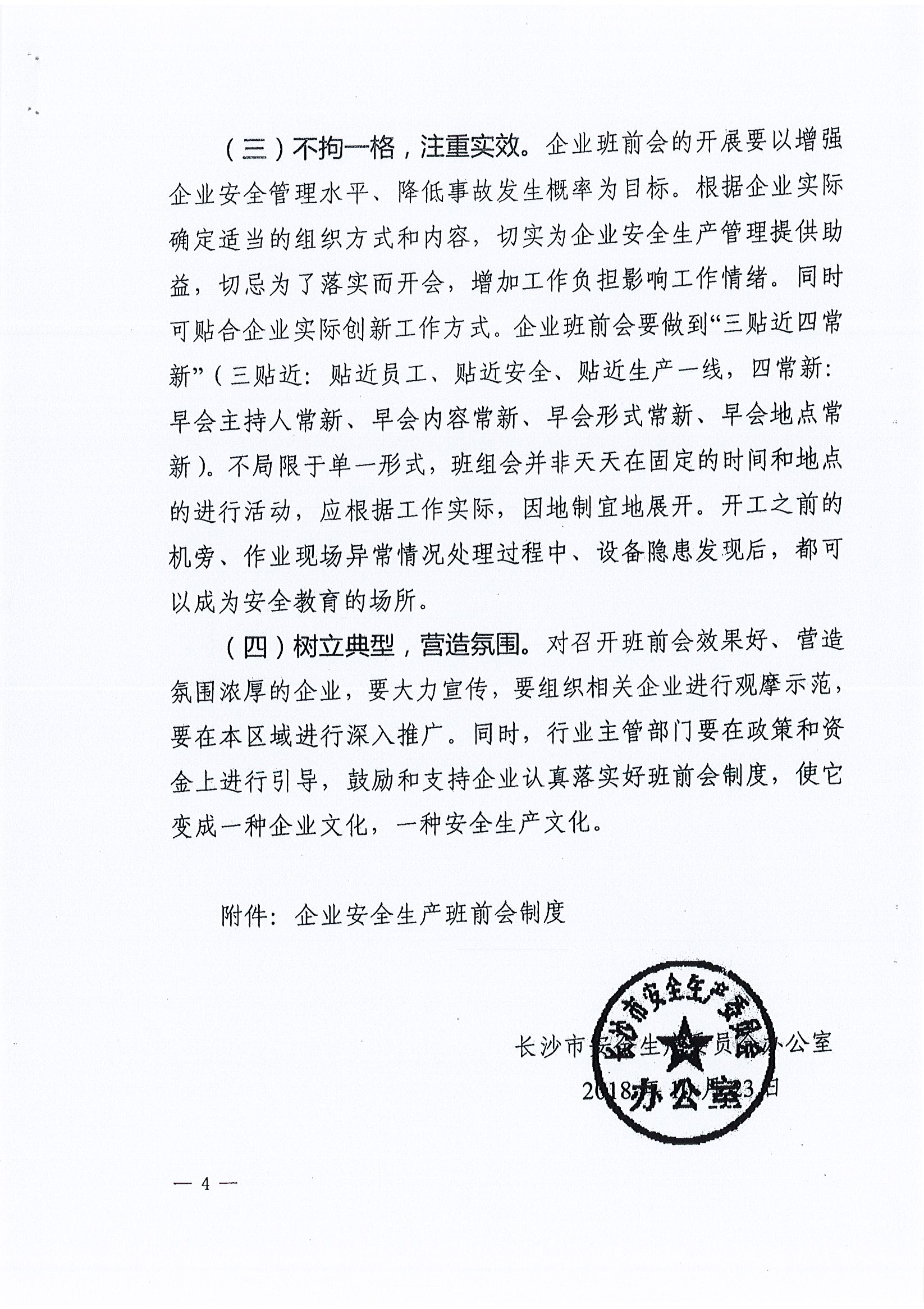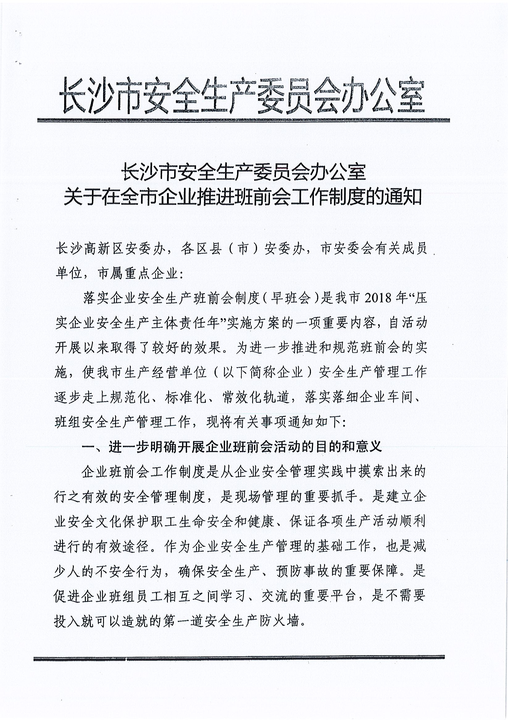 長沙市安全生產(chǎn)委員會辦公室關(guān)于在全市企業(yè)推進班前會工作制度的通知