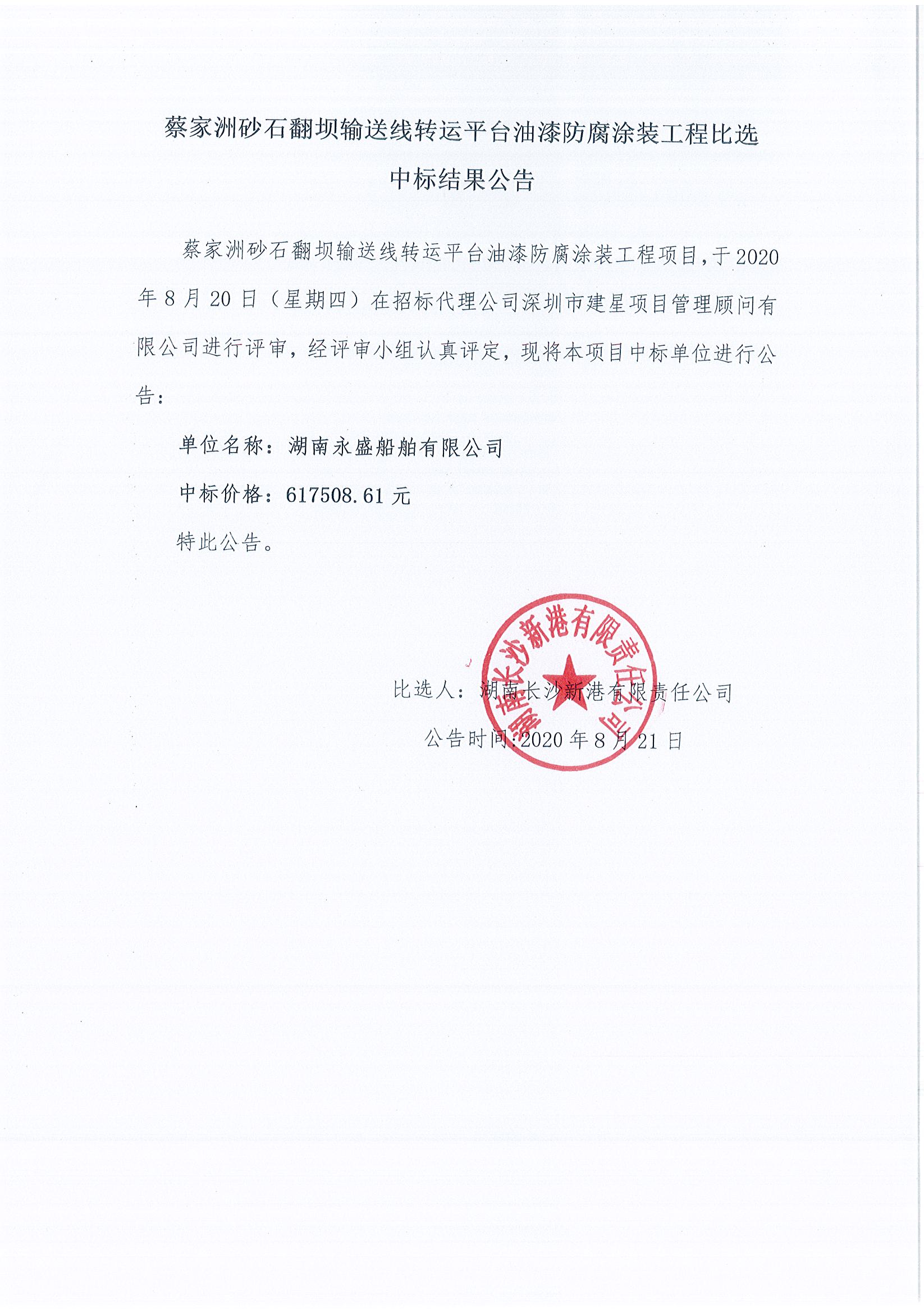 蔡家洲砂石翻壩輸送線轉(zhuǎn)運(yùn)平臺(tái)油漆防腐涂裝工程比選中標(biāo)結(jié)果公告