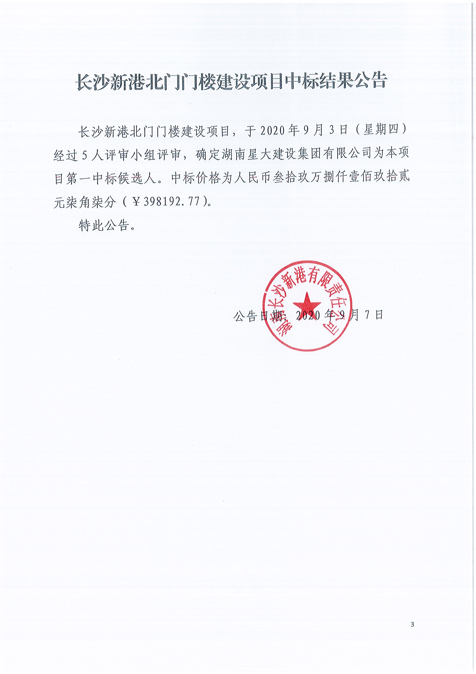 長沙新港北門門樓建設(shè)項目中標結(jié)果公告
