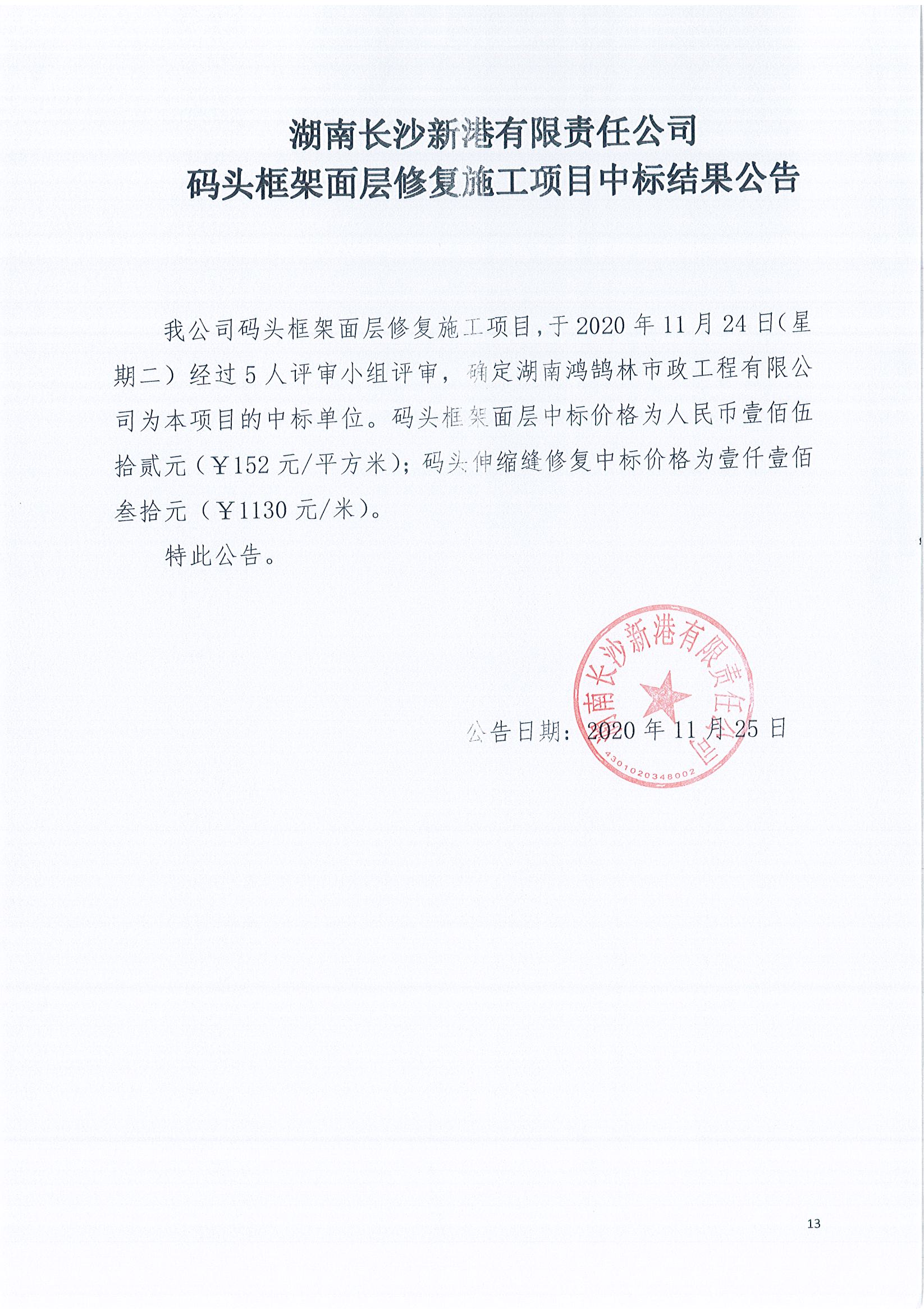 湖南長沙新港有限責(zé)任公司碼頭框架面層修復(fù)施工項目中標結(jié)果公告