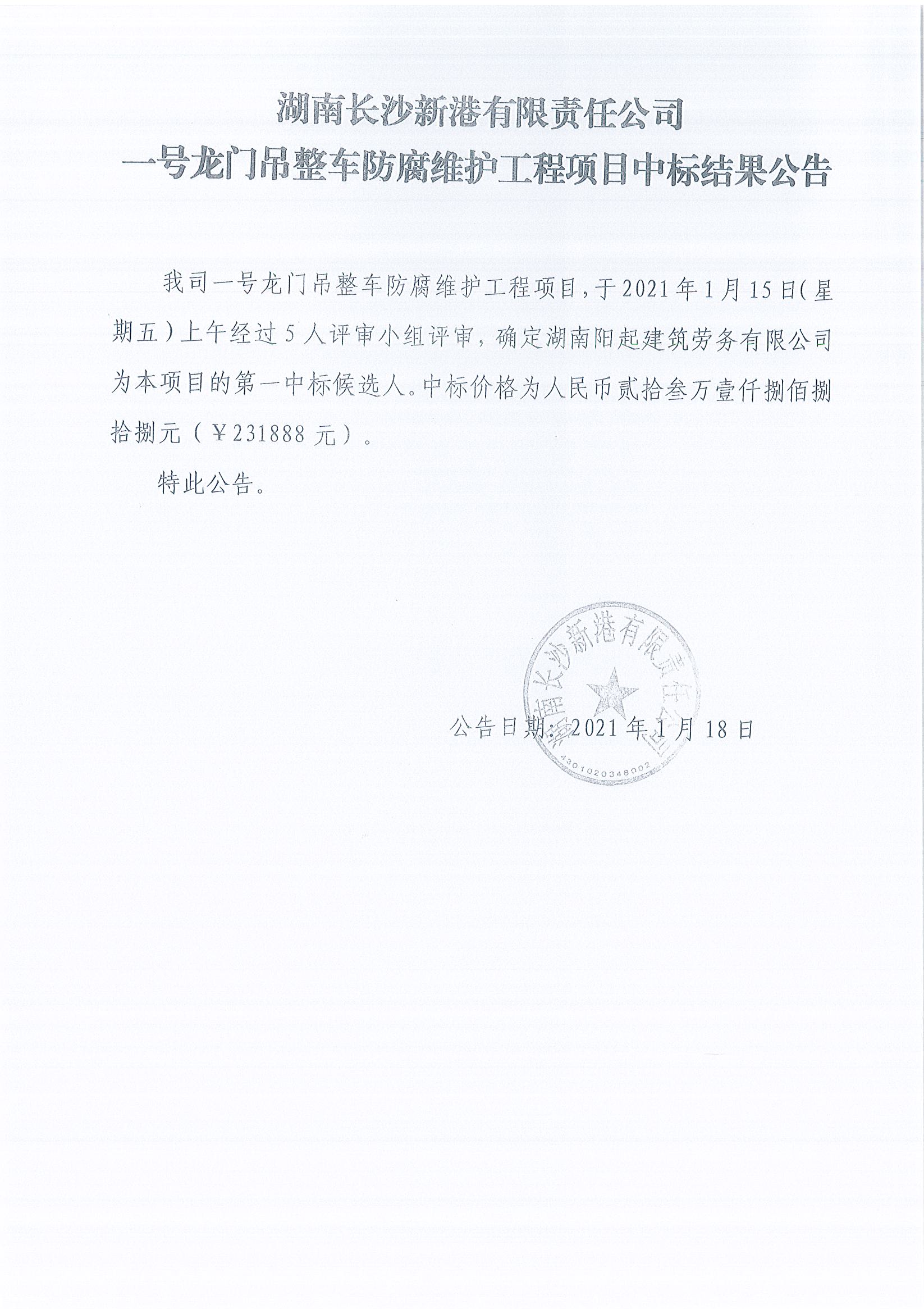 湖南長沙新港有限責(zé)任公司一號龍門吊整車防腐維護工程項目中標(biāo)結(jié)果公告