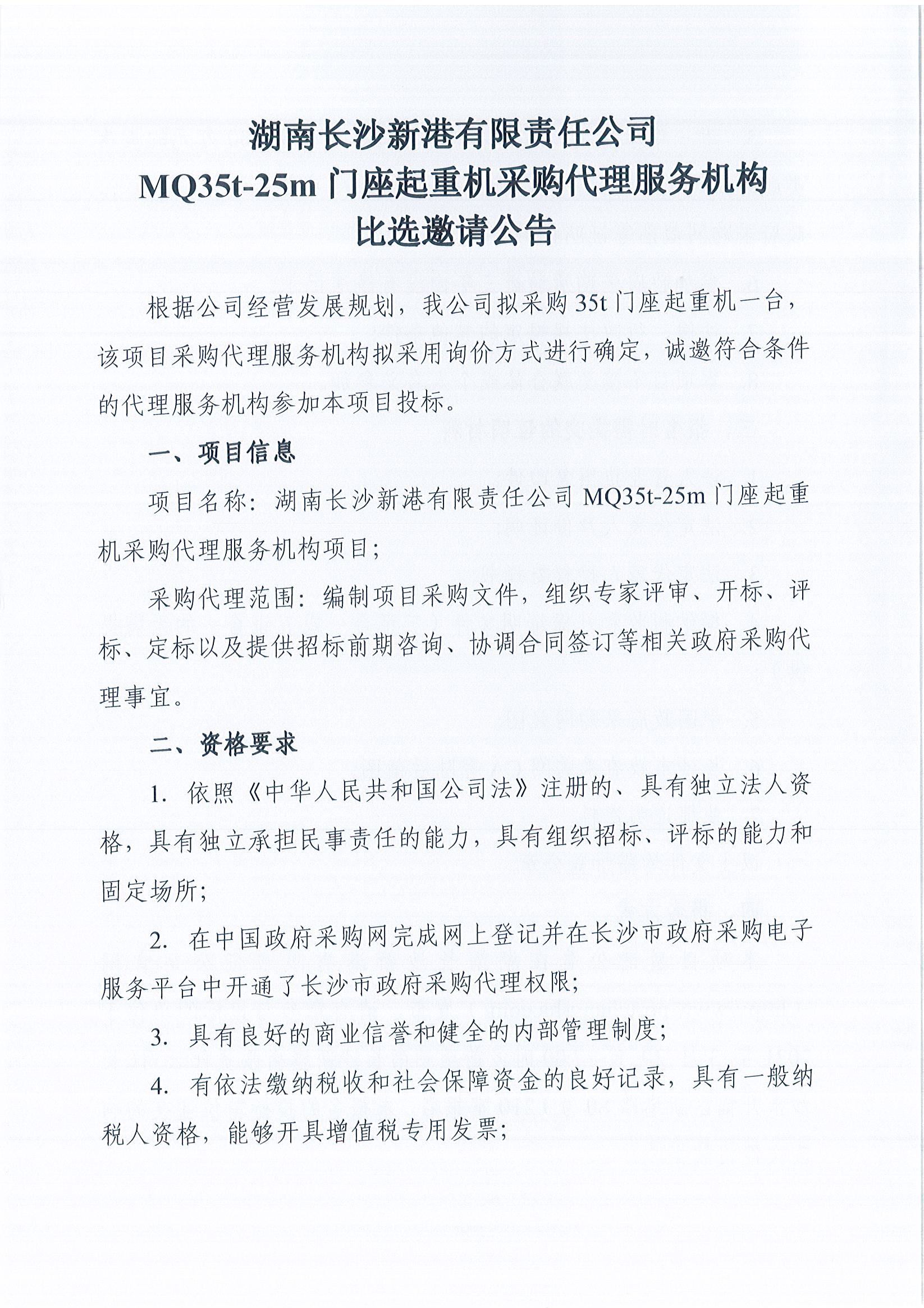 湖南長沙新港有限責任公司MQ35t—25m門座起重機采購代理服務機構(gòu)比選邀請公告