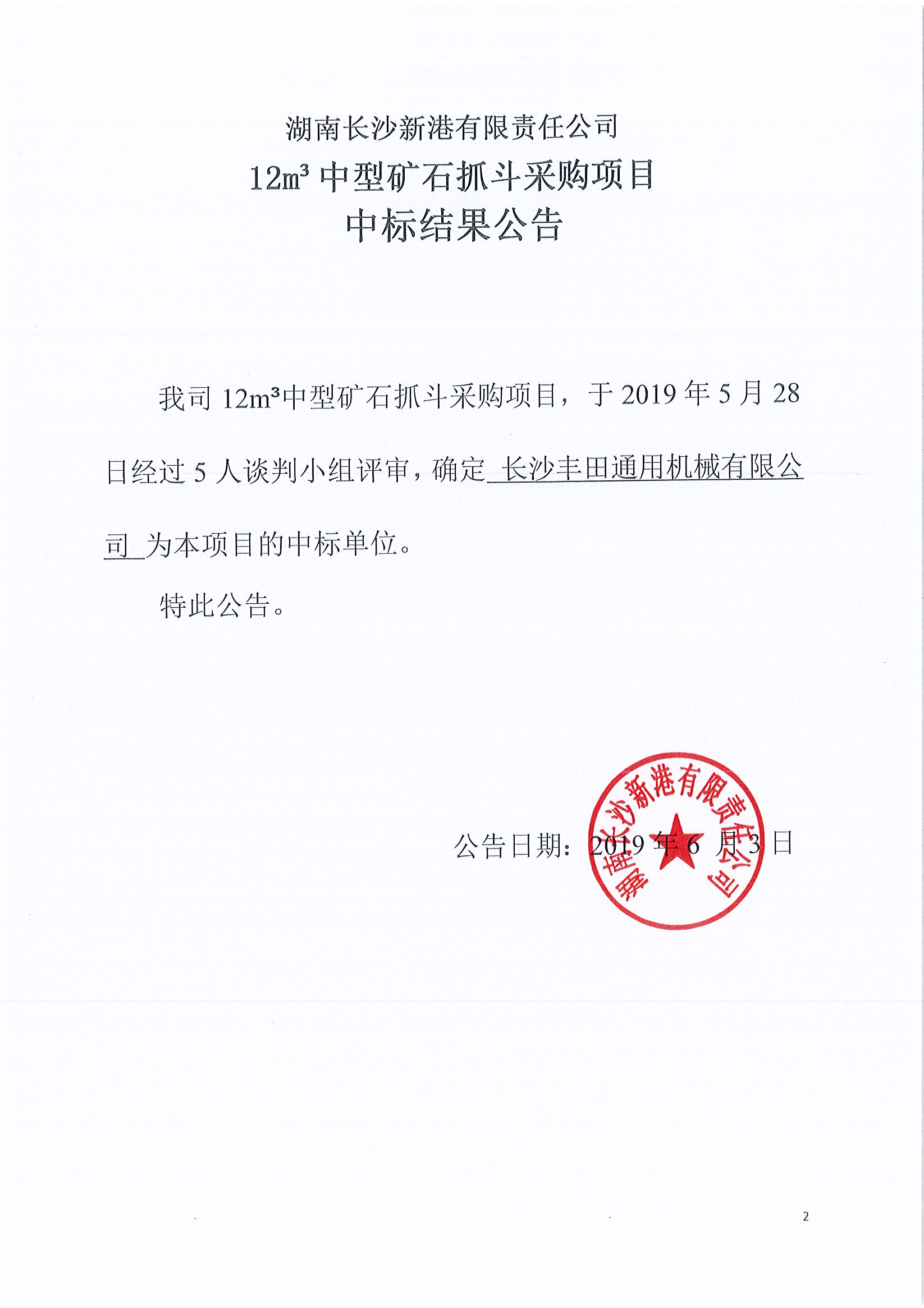 湖南長沙新港有限責(zé)任公司12m³中型礦石抓斗采購項目中標(biāo)結(jié)果公示