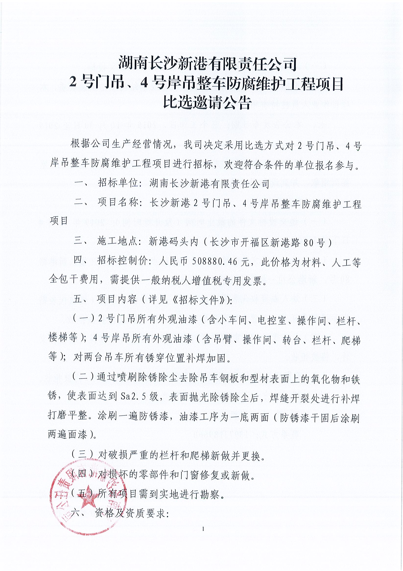 湖南長沙新港有限責(zé)任公司2號門吊、4號岸吊整車防腐維護工程項目比選邀請公示