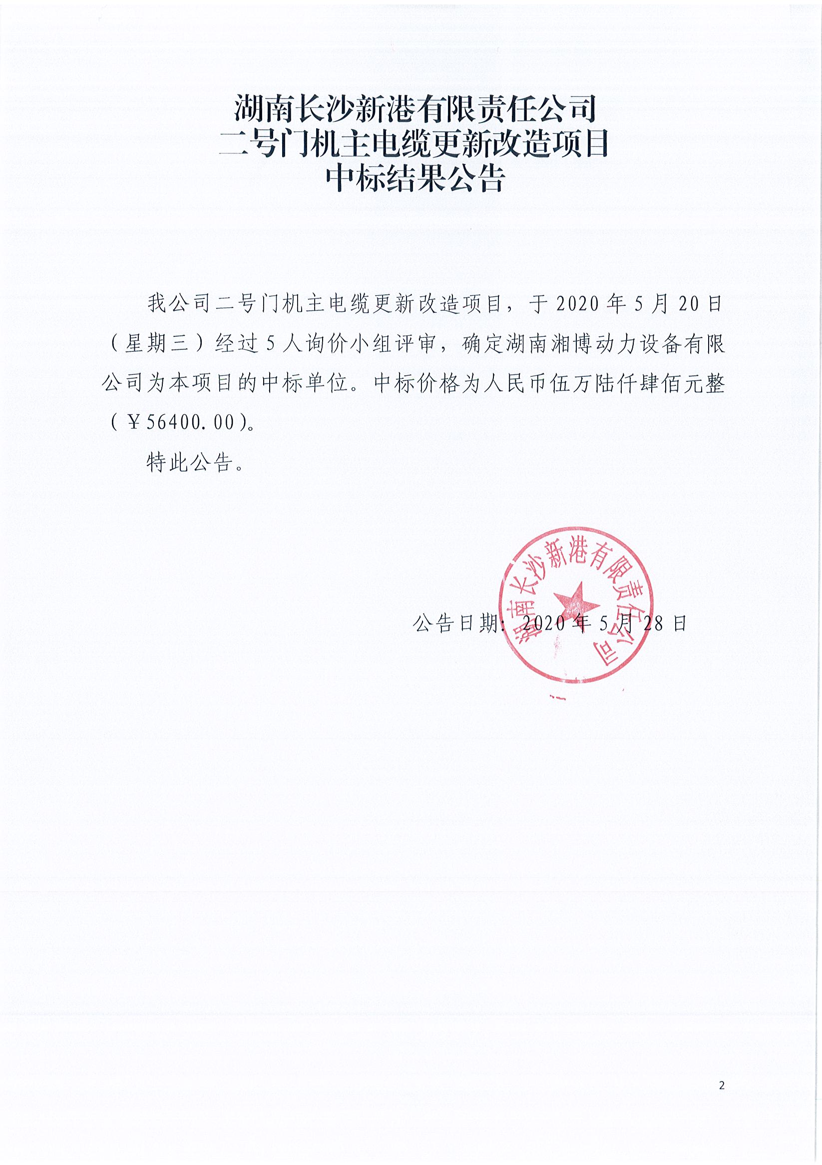 二號門機主電纜更新改造項目《中標結(jié)果公告》